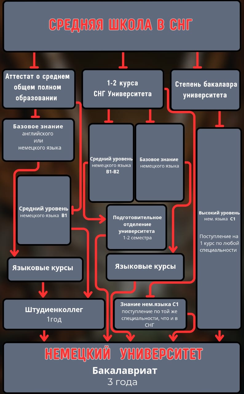 - Для студентов других стран требования другие. Нужно сдать экзамен на знание языка. Для студентов из России, Казахстана, Украины - проучиться 1 года в ВУЗе своей страны или пройти 1 год специальной подготовки для иностранных студентов при немецком университете.